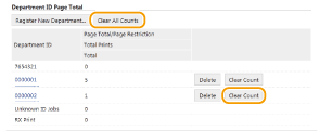 ถ้าคุณต้องการเปลี่ยนจำนวนกลับไปเป็นศูนย์ ให้คลิกลิงค์ข้อความที่เกี่ยวข้องใต้ [Department ID] และคลิก [Clear Count]  [OK] ถ้าคุณต้องการเปลี่ยนจำนวนของ ID แผนกทั้งหมดกลับไปเป็น ให้คลิก [Clear All Counts]  [OK] |
