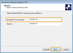 4 | ใส่ที่อยู่ IP หรือชื่อ DNS ของเครื่อง และคลิก [ถัดไป] [ชื่อพอร์ต] จะใส่โดยอัตโนมัติ แต่คุณสามารถเปลี่ยนได้ หากจำเป็น ![]() ![]() เมื่อหน้าจอถัดไปแสดงขึ้น ให้ทำตามคำแนะนำบนหน้าจอ ![]() *เมื่อคุณเลือก [ชนิดอุปกรณ์] ให้เลือก [Canon Network Printing Device with P9100] ใน [มาตรฐาน] |