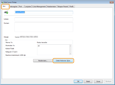Klik [Print Test Page] dalam tab [General].