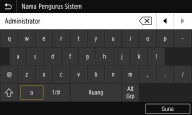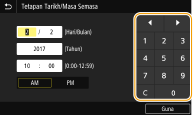 Julat nilaiNilai dalam ( ) dipaparkan kotak entri ialah julat nilai yang boleh dimasukkan. Apabila butang selain kekunci angka dipaparkanApabila <+>/<-> atau / dipaparkan, anda boleh mengetik butang dan meningkatkan atau mengurangkan nilai angka atau mengalihkan kursor. |