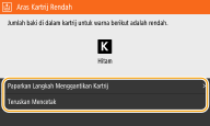 Apabila mesej dipaparkan Apabila menyalin atau mencetak, anda boleh terus mencetak dokumen asal. Jika mesej dipaparkan semasa dokumen I-Fax sedang diterima, mesin tidak melakukan pencetakan supaya cetakan tidak jelas dielakkan. Untuk terus mencetak walaupun jumlah baki dalam kartrij toner semakin kurang, tetapkan <Terus Cetak Apbl Krtrij Rendah>/<Terus Mncetak Apbl Jum.dlm Katrij Rendah> kepada <Aktif>. <Terus Cetak Apbl Krtrij Rendah>/<Terus Mncetak Apbl Jum.dlm Katrij Rendah>Tentukan apabila mesej dipaparkan |