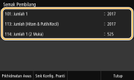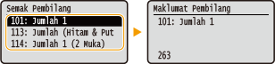 Anda boleh memeriksa jumlah bilangan halaman yang dicetak oleh mesin. Jumlah cetakan ini termasuk cetakan daripada cetakan media memori dan juga senarai cetakan data daripada komputer.