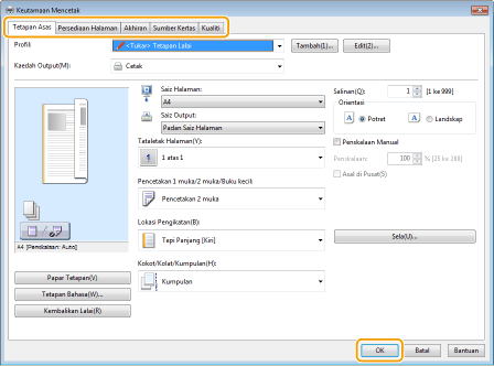 Tentukan tetapan cetakan sebagaimana diperlukan dan klik [OK].