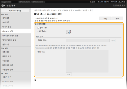 2 | 주소 예외를 지정합니다. [등록할 주소] 텍스트 상자에 IP 주소(또는 IP 주소 범위)를 입력하고 [추가]를 클릭합니다. 입력 오류 확인 IP 주소가 잘못 입력된 경우 리모트 UI에서 기기에 액세스하지 못할 수도 있으며 이러한 경우 <IPv4 주소 필터> 또는 <IPv6 주소 필터>를 <해제>로 설정해야 합니다. <IPv4 주소 필터><IPv6 주소 필터>IP 주소 입력 양식 | 설명 | 예 | 단일 주소 입력 | IPv4: 마침표로 숫자를 구분합니다. | 192.168.0.10 | IPv6: 콜론으로 영숫자 문자를 구분합니다. | fe80::10 | 주소 범위 지정 | 주소 사이에 하이픈을 삽입합니다. | 192.168.0.10-192.168.0.20 | 프리픽스로 주소 범위 지정 | 주소를 입력하고 이어서 슬래시와 프리픽스 길이를 나타내는 숫자를 입력합니다. | 192.168.0.32/27 fe80::1234/64 |
