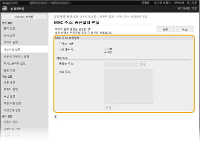조작 패널 사용홈 화면의 <메뉴>로부터 MAC 주소 필터링을 활성화하거나 비활성화할 수도 있습니다. <MAC 주소 필터> |