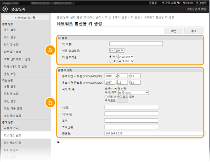 TLS(Transport Layer Security)를 통한 암호화된 통신에 필요한 경우 기기에서 키 및 인증서를 생성할 수 있습니다. 리모트 UI를 통해 기기에 액세스할 때 TLS를 사용할 수 있습니다. 자가 서명 인증서가 "네트워크 통신"에서 생성된 키 및 인증서에 사용됩니다.