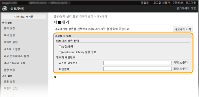 흑백 LCD 모델에는 [설정/등록]/[Application Library 설정 정보]이 표시되지 않습니다. 다양한 기기 설정을 내보낼 수 있습니다.