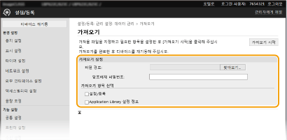 흑백 LCD 모델에는 [설정/등록]/[Application Library 설정 정보]가 표시되지 않습니다. 다양한 기기 설정을 가져올 수 있습니다.