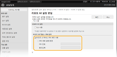 ![]() 조작 패널 사용리모트 UI 액세스 PIN 설정은 홈 화면의 <메뉴>에서도 액세스할 수 있습니다. <리모트 UI 설정> <관리 설정>이 초기화된 경우리모트 UI 액세스 PIN도 초기화됩니다. 초기화된 후에 PIN을 리셋합니다. <메뉴 초기화> |