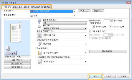 본 기기의 프린터 드라이버를 선택하고 [기본 설정] 또는 [속성]을 클릭합니다.