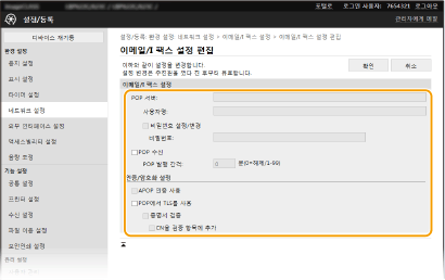 이것은 POP3 서버에 자동으로 연결하는 데에 사용되는 간격(분 단위)을 설정합니다. 서버에 I-팩스 문서가 있으면 자동으로 수신되어 인쇄됩니다.