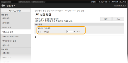 2 | 필요에 따라 설정을 구성합니다. ![]() [LPD 인쇄 사용] LPD를 통해 인쇄하려면 확인란을 선택합니다. LPD 인쇄를 사용하지 않을 경우 확인란 선택을 해제합니다. [RAW 인쇄 사용] RAW를 통해 인쇄하려면 확인란을 선택합니다. RAW 인쇄를 사용하지 않을 경우 확인란 선택을 해제합니다. [수신 타임아웃] 데이터 수신을 위한 재기동 대기 시간으로 값을 설정합니다. 데이터 수신이 설정 시간내에 복귀되지 않으면 인쇄를 취소합니다. |