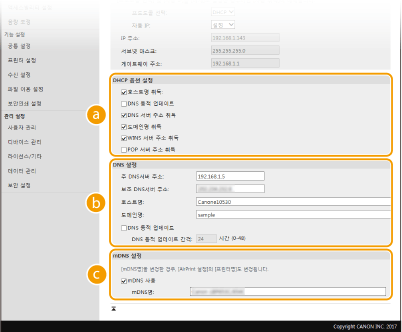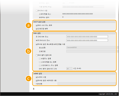 2 | IPv4 DNS 설정을 구성합니다. ![]() [DHCP 옵션 설정][호스트명 취득] DHCP 서버에서 호스트 이름을 획득하도록 옵션 12를 설정하려면 확인란을 선택합니다. [DNS 동적 업데이트] DHCP 서버를 통해 DNS 레코드를 동적으로 업데이트하도록 옵션 81을 설정하려면 확인란을 선택합니다. [DNS 서버 주소 취득] DHCP 서버에서 DNS 서버 주소를 획득하도록 옵션 6을 설정하려면 확인란을 선택합니다. [도메인명 취득] DHCP 서버에서 도메인 이름을 획득하도록 옵션 15를 설정하려면 확인란을 선택합니다. [WINS 서버 주소 취득] DHCP 서버에서 WINS 서버 주소를 획득하도록 옵션 44를 설정하려면 확인란을 선택합니다. [POP 서버 주소 취득] DHCP 서버에서 POP3 서버 주소를 획득하도록 옵션 70을 설정하려면 확인란을 선택합니다. [DNS 설정][주 DNS서버 주소] DNS 서버의 IP 주소를 입력합니다. [보조 DNS서버 주소] 보조 DNS 서버가 있는 경우 해당 IP 주소를 입력합니다. [호스트명] DNS 서버에 등록할 기기의 호스트 이름에 영숫자 문자를 입력합니다. [도메인명] 기기가 속한 도메인 이름에 영숫자 문자를 입력합니다(예: "example.com"). [DNS 동적 업데이트] 기기의 IP 주소가 변경될 때마다 DNS 레코드를 동적으로 업데이트하려면 확인란을 선택합니다. 업데이트 간격을 지정하려면 [DNS 동적 업데이트 간격] 텍스트 상자에 시 단위로 시간을 입력합니다. [mDNS 설정][mDNS 사용] Bonjour에서 적용된 mDNS(multicast DNS)는 DNS를 사용하지 않고 호스트 이름을 IP 주소와 연계하는 프로토콜입니다. 확인란을 선택하여 mDNS를 활성화하고 [mDNS명] 텍스트 상자에 mDNS 이름을 입력합니다. |