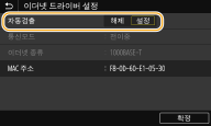 수동으로 이더넷 설정 구성1 | 자동 검색을 비활성화하는 설정을 구성합니다. 터치 패널 모델 <자동검출>에서 <해제>를 선택합니다. 흑백 LCD 모델 <자동검출> <해제>를 선택합니다. |