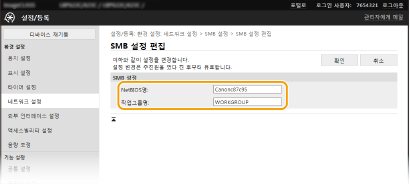 작업그룹명은 Windows 네트워크에서 파일 공유 등 기본 네트워크 기능을 사용할 수 있도록 여러 컴퓨터를 그룹화하는데 사용되는 이름입니다. 기기가 속한 그룹을 식별하려면 작업그룹명을 지정합니다.