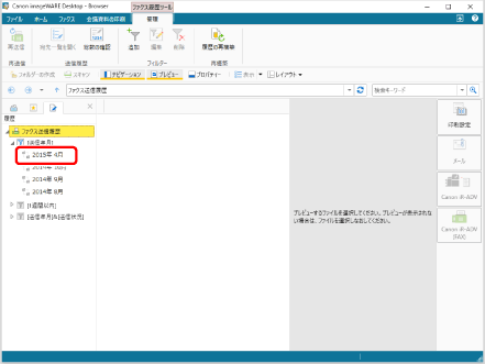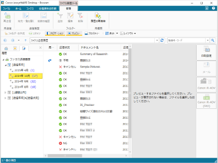 送信の開始時刻と通信時間は、デバイスの操作パネルで確認できます。 送信結果が ファイルリストビューウィンドウでは、送信履歴の表示方法をサムネイル表示、またはリスト表示から選択できます。 ファイルリストビューウィンドウのヘッダーを右クリックして表示する[詳細表示の設定]で、表示する項目を変更できます。 ファイルリストビューウィンドウのリスト項目名をクリックして、一覧の内容を昇順、または降順に並べ替えられます。 送信履歴の表示中はアドレスバーの ファイルリストビューウィンドウには5000件までの送信履歴が表示され、5000件を超えた送信履歴は表示されません。5000件を超す送信履歴を確認するには、ファイルリストビューウィンドウのリスト項目名をクリックして、表示順序を並べ替えてください。 デバイスの送信処理で送信履歴が追加されたとき、および送信状況が更新されたときに、ファイルリストビューウィンドウの表示内容は自動で更新されます。 Desktopはサロゲート文字に対応していないため、[ファクス送信履歴]に表示される文字列にサロゲート文字が含まれる場合、その部分は"??"と表示されます。 ファイルリストビューウィンドウに表示されている送信履歴を利用してファクスの再送ができます。ファクスを再送する方法については、次を参照してください。 |