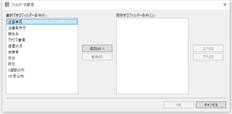 [ファクス送信履歴]に登録できるフィルターの数は、初期設定で登録されているフィルターを含めて30個までです。 追加したフィルターはナビゲーションウィンドウの一番下に表示されます。 フィルターの並び順は変更できません。フィルターの並び順を変更する場合は、いったんフィルターを削除して、追加し直してください。フィルターの削除方法については、次を参照してください。 |