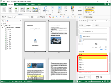 給紙部の設定は、ページ > 章単位 > 文書の順番に優先されます。 キヤノン製プリンターを選択し、詳細ウィンドウの[印刷設定]タブ、リボンのコマンド、ツールボタンのいずれかで、[Editorの印刷設定を使用]にチェックマークを付けた場合に設定できます。 文書の本文とは、[挿入する用紙]で指定する次以外の部分です。 表紙 裏表紙 インデックス紙 合紙 表紙、裏表紙、インデックス紙、および合紙の設定方法については、次を参照してください。 章単位で給紙部を設定する方法については、次を参照してください。 ページ単位で給紙部を設定する方法については、次を参照してください。 |