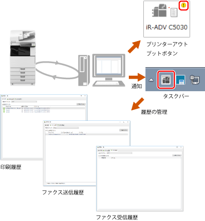 Desktopでは、印刷/ファクス送信結果の確認がコンピューター上で行えます。タスクバーにある処理状態を表示するアイコンが、ジョブの処理状況に応じて変化します。その結果、今まで確認に手間取っていた作業がコンピューター上で簡単に行えるので、印刷/ ファクス送信業務の効率化につながります。