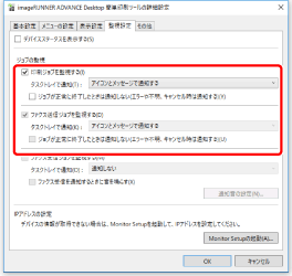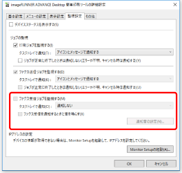 [監視設定]タブで、[ファクス受信ジョブを監視する]にチェックマークを付けて、通知の方法を選択します。