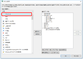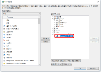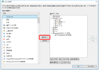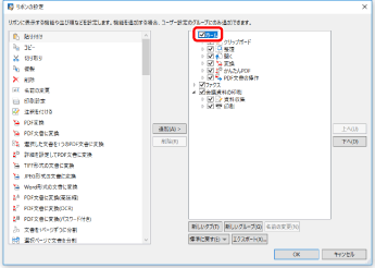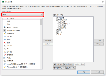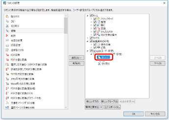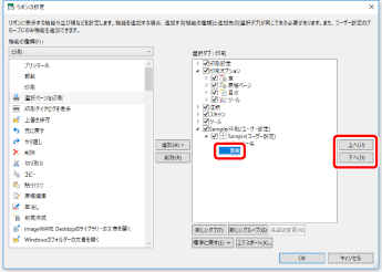 タブの並び順を変更する場合は、右側の一覧から並び順を変更するタブを選択して、[上へ]/[下へ]をクリックします。