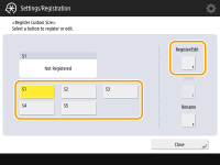 You can register up to five frequently used free sizes of paper. The paper sizes registered here are displayed on the paper size selection screen for the paper drawer and multi-purpose tray (Specifying Paper Size and Type in the Paper Drawer or Specifying Paper Size and Type in the Multi-purpose Tray).