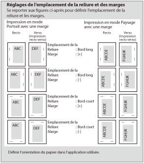 Ce réglage permet de déterminer si la position de reliure se situe sur le bord long ou sur le bord court des feuilles. En cas de reliure avec impression recto verso, l'orientation de l'image est automatiquement réglée sur la mise en page correcte.