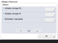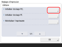 La zone de stockage ne peut pas être initialisée dans les conditions suivantes : Réception ou impression de données d'impression. (Il est recommandé de débrancher le câble reliant la machine au concentrateur, pour empêcher la réception des données d'impression.) Installation ou désinstallation de polices. Les étapes décrites ci-après concernent l'initialisation de la zone de stockage PCL. Pour initialiser la zone de stockage PS, procéder de la même façon, en ignorant l'étape 4, sélectionner [Initialiser stockage PS]. |