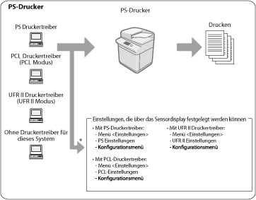 Unterschiede in der Bedienung bei UFR II, PCL, PS und Direct Print Druckern