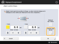 Lorsque vous ouvrez à nouveau l'écran <Régler la position d'image> après avoir fermé cet écran en appuyant sur <OK>, les valeurs sur l'écran sont remises à <0>. Cependant, la valeur réglée est toujours effective. Si vous répétez les étapes, lisez la valeur des repères enregistrés sur la nouvelle page de test et saisissez la nouvelle valeur.