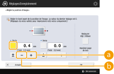 Sur l'écran <Régler la position d'image>, appuyez sur <-> ou <+> afin de régler <Recto> pour <Alignement bord avant> de sorte que la ligne centrale du repère enregistré soit alignée avec le bord du papier.