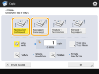 A seconda delle funzioni di finitura, è necessario installare dei dispositivi opzionali. Apparecchiature opzionali A causa del tipo di carta, non è possibile usare le funzioni di finitura. Specifiche hardware Quando si posiziona un originale sul vetro di letturaPremendo <Opzioni> <Creazione lavoro> sulla schermata delle funzioni di base per la copia è possibile usare la funzione Fascicolazione/Gruppo anche se l'originale viene posizionato sul vetro di lettura.Inserire un separatore di lavori tra ogni pagina durante l'uscita di un gruppoSe si seleziona <Raggruppam. (stesse pagg)>, è possibile inserire un separatore di lavori tra ciascun gruppo. Per ulteriori informazioni, vedere <Separatore lavori tra i gruppi>. <Copia> <Separatore lavori tra i gruppi>Quando si configurano le impostazioni in <Accesso a file memorizzati>La funzione di finitura può essere utilizzata solo quando si stampa un file PDF/XPS o un file memorizzato nella Mailbox. |
