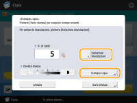 Premere <Variazione impostazioni> per modificare le impostazioni. Viene visualizzato <Esempio copia> una volta effettuata la modifica delle impostazioni. Fare nuovamente una copia di prova.