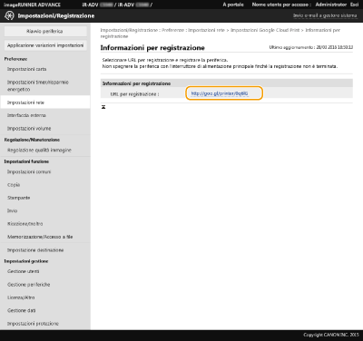 Fare clic sul collegamento dell'URL visualizzato per [URL per registrazione].