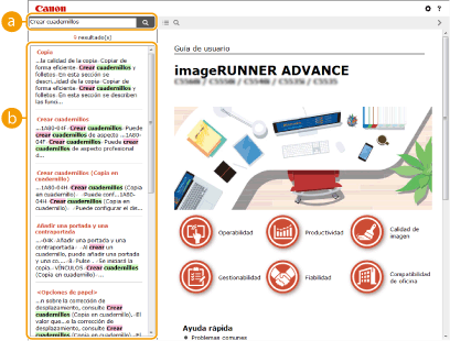 Haga clic para visualizar información sobre cómo ver la Guía de usuario, cómo realizar una búsqueda y otra información.