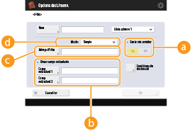 Tot i que hi ha elements que podeu establir a l'opció de fax ( Pantalla de funcions bàsiques de fax), és convenient configurar-los aquí si voleu canviar les condicions d'enviament per a cada destinació.
