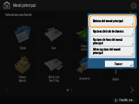 El Menú principal és la pantalla d'inici per a les funcions. Tot i que el Menú principal està configurat per a un ús senzill en el moment de la compra, podeu personalitzar-lo perquè s'ajusti millor a les vostres operacions diàries. Per personalitzar el Menú principal, heu d'iniciar sessió amb privilegis d'administrador.