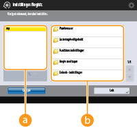 (Indstillinger/Registrering) for at få vist <Indstillinger/Registr.>-skærmen. Tryk først på denne tast for at udføre ændringer for hver indstilling, som f.eks. indstillinger for papir, display og netværk. På dette skærmbillede kan du også registrere modtagere, som f.eks. e-mailadresser og faxnumre.