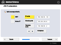 Jos haluat määrittää IP-osoitteen manuaalisesti, poista valinta kohdassa <DHCP> tai <Autom. IP>, kirjoita arvot valitsemalla <IP-osoite>, <Aliverkon peite> ja <Yhdyskäyt. osoite> ja valitse sitten <Seuraava> tai <OK>.