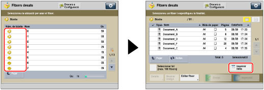 Encara que ordeneu la llista de fitxers desats prement [Nom] o [Data/hora], la llista de fitxers s'imprimirà en l'ordre en què els fitxers s'han desat a la bústia. |