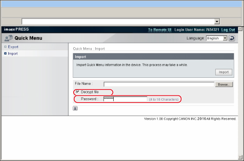 No apagueu el botó d'alimentació de l'equip mentre exporteu/importeu un botó personal o compartit, ja que si ho feu és possible que no funcioni bé. No obriu ni editeu els fitxers XML exportats, ja que podríeu fer que l'equip no funcionés bé. Per poder utilitzar l'IU remot, activeu [IU remot] a [Opcions de gestió] (Configuració). (Vegeu "IU remot").Només l'administrador del sistema o l'administrador del sistema SSO-H (Administrador)/Administrador de xarxa (NetworkAdmin)/Administrador de dispositius (DeviceAdmin) pot dur a terme operacions a la pàgina Menú ràpid. Per obtenir informació sobre els tipus d'administradors, vegeu "Opcions d'administrador". |