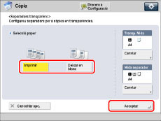 Fins i tot si hi ha una unitat d'acabat instal·lada, no podeu fer servir cap dels modes d'[Acabat] amb [Separadors transparènc.]. |