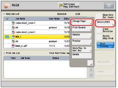 To check whether necessary paper is loaded in the specified paper source for the job, select the desired job and then press .If the specified paper source runs out, is displayed, if paper in the specified paper source is inappropriate, is displayed, on the right end of the list. |