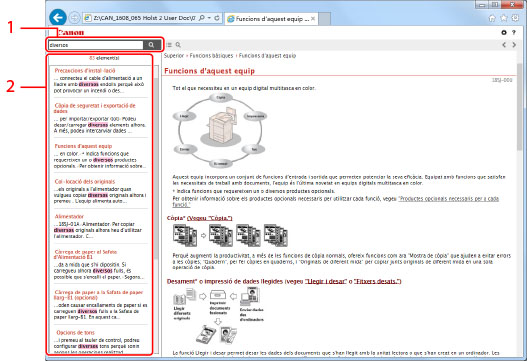 2. | Resultat de la cerca Apareixen els resultats de la cerca d'una paraula clau. Si n'hi ha més de 10, podeu veure la resta de resultats fent clic a l'opció [Mostrar més…] que hi ha a sota dels resultats. |