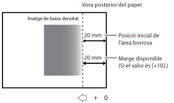 Per exemple, si la imatge es comença a fer borrosa a uns 20 mm de la vora del paper, podeu millorar la situació ampliant l'àrea de correcció a 20 mm. En aquest cas, introduïu [+10]. L'interval efectiu de correcció augmenta 2 mm cada vegada que [Correcció total] s'incrementa en +1. Si establiu l'opció [Correcció total] amb el valor +10, l'interval efectiu per a la correcció és de 20 mm des de la vora posterior del paper.