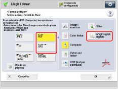 Si voleu establir la signatura digital i el xifratge al fitxer PDF, especifiqueu les opcions per al PDF xifrat de la manera següent. Quan establiu [Sol·licitar contras. per canviar permís] a la pantalla Xifrar, seleccioneu [Canvis menys extreure pàgines] de la llista desplegable Permetre canvis que hi ha a la mateixa pantalla. Podeu establir diverses signatures digitals per a un mateix fitxer. En aquest cas, les signatures de dispositiu s'apliquen abans que les signatures d'usuari. Si el lector verifica amb l'Adobe Reader/Adobe Acrobat o el XPS Document Viewer un fitxer PDF o un fitxer XPS que incloguin diverses signatures, només haurà variat l'última aplicada al fitxer. La resta de signatures hauran variat a conseqüència d'haver-ne afegit algunes. Per obtenir més informació sobre la validació de certificats, el registre de certificats a la llista de confiança i la validació de signatures per part del lector, vegeu la documentació del programari que admet el format PDF (com Adobe Reader/Adobe Acrobat) o el format XPS (com XPS Document Viewer). Si activeu [Optimitzar PDF per a web], les opcions de PDF es poden establir com a una de les següents: Signatura de dispositiu o signatura d'usuari. (Vegeu "Optimització de PDF per a web"). El fitxer PDF/XPS conté informació de l'emissor que el lector del fitxer pot emprar per validar la fiabilitat de la signatura del dispositiu comparant-la amb el número d'empremta electrònica MD5 o SHA-1. Podeu verificar aquesta informació a [Emprenta digital cert.] en aquest equip. (Vegeu "Signatures digitals"). L'adreça de correu electrònic de l'usuari està establerta per a la propietat d'autor d'un fitxer PDF o XPS amb una signatura d'usuari si hi ha una adreça de correu electrònic desada a la informació d'SSO-H de l'usuari. No podeu reenviar un document d'I-fax rebut amb una signatura d'usuari des de l'equip. Per obtenir informació sobre l'autoritat de certificació que emet el certificat d'usuari per a cada usuari compatible amb l'equip per afegir un certificat d'usuari, vegeu la nota inclosa al producte opcional. A l'hora d'establir signatures visibles heu de tenir en compte el següent: Només podeu establir signatures visibles quan el fitxer PDF tingui establerta una signatura de dispositiu o d'usuari. No podeu establir signatures visibles si l'opció [Format de PDF a PDF/A] està activada. (Vegeu "Format de fitxers PDF a PDF/A"). |
