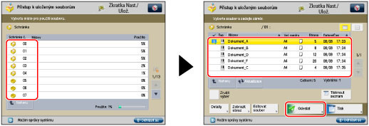 Lze zadat a odeslat až na 256 míst určení najednou. Zadáte-li však jako místo určení skupinovou adresu, každá adresa uložená do této skupiny se počítá jako jedno místo určení. Pokusíte-li se odesílat na souborový server, pro který je volba [Potvrdit před odesláním] nastavena na Zap, zobrazí se obrazovka požadující zadání hesla souborového serveru. V takovém případě zadejte heslo souborového serveru. Chcete-li uložit souborový server do skupinové adresy, nastavte volbu [Potvrdit před odesláním] na Vyp. Na skupinovou adresu obsahující souborový server, kde je položka [Potvrdit před odesláním] nastavena na Zap, nelze odesílat. (Viz část "Uložení adresy souborového serveru.") Chcete-li, aby se vybraný dokument po odeslání automaticky smazal, stiskněte [Po odeslání smazat soub.]. Během odesílání nemůžete dokument vytisknout nebo uložit do jiné schránky. Je-li vybrané místo určení skupinová adresa, která zahrnuje schránku, odesílaný soubor nebude do dané schránky odeslán (a uložen). Místa určení uložená v tlačítkách volby na jeden dotek na obrazovce Rychlá nabídka klientského stroje se neaktualizují, aniž když se aktualizují tlačítka uložená v tlačítkách volby na jeden dotek serverového stroje. Pokud se vám nedaří na místo určení odesílat, zkontrolujte, zda není staré. |