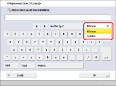 Zadáváte-li znaky na obrazovce ověřování přístupových práv služby SSO-H nebo ve funkcích aplikace MEAP, může se stát, že obrazovka, kterou ve skutečnosti uvidíte, bude odlišná. Informace týkající se zobrazení klávesnice viz v popisech jednotlivých funkcí. |