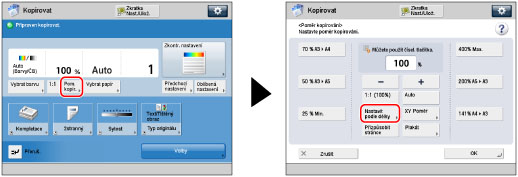 Stroj správný poměr kopírování (zoomu) vypočítá automaticky na základě zadaných hodnot; Může se však stát, že obraz originálu bude mírně oříznut, což závisí na velikosti papíru.