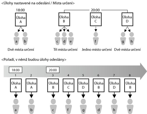 Pro odložené odesílání můžete rezervovat až 120 úloh. Skutečný počet odesílaných úloh, které stroj dokáže zpracovat, však může být menší než 120, což závisí na následujícím: Zda je odesíláno více dokumentů najednou. Zda jsou odesílány rozsáhlé dokumenty. Zda je pro schránku a fax./I-fax. schránku používáno velké množství paměti Počet odložených úloh odesílání, které lze rezervovat, se může také snížit, pokud stroj zpracovává další úlohy, pro něž není nastavené odložené odesílání, nebo v důsledku jiných faktorů, které mají vliv na zadaná místa určení. Po odeslání odložených dokumentů se dokumenty z paměti automaticky vymažou. Na stroji můžete zkontrolovat stav nebo zrušit či změnit místa určení dokumentů, pro které byl předem zadán čas odeslání. (Viz"Kontrola stavu úloh", "Zrušení úlohy" nebo "Opětovné odesílání úloh/změna místa určení.") |